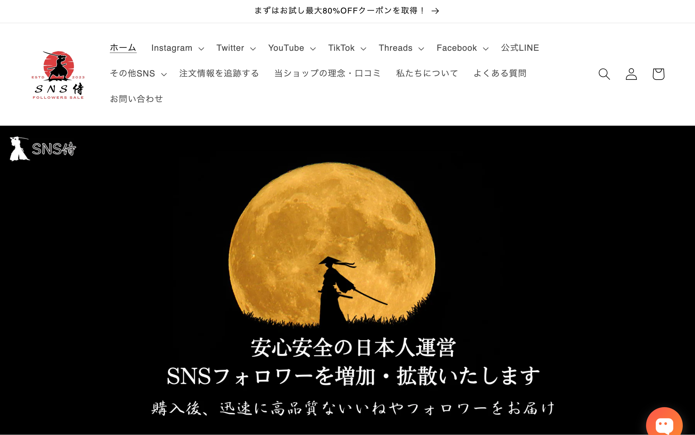SNS侍は、2022年頃から運営されている比較的新しいフォロワー販売サービスです。Instagram、X、TikTok、YouTubeなど幅広いSNSに対応しており、「リアルなアカウントを提供する」ことを売りにしていますが、実際に使ってみると非公開アカウントが多く、日本人フォロワーを買っても海外アカウントが混ざっていて品質があまり高くない印象でした。